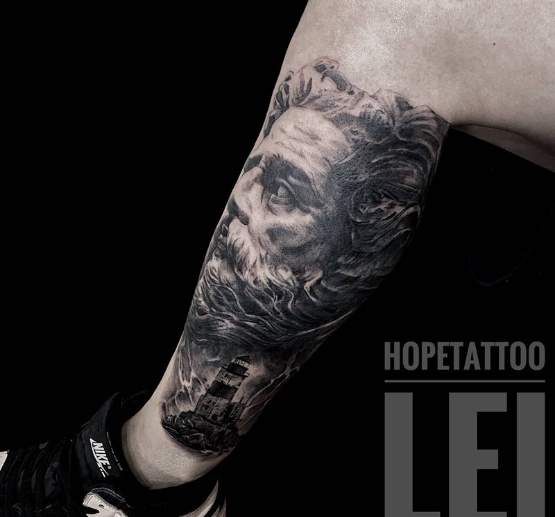 遮盖波塞冬纹身图片_腿部欧美写实纹身图案