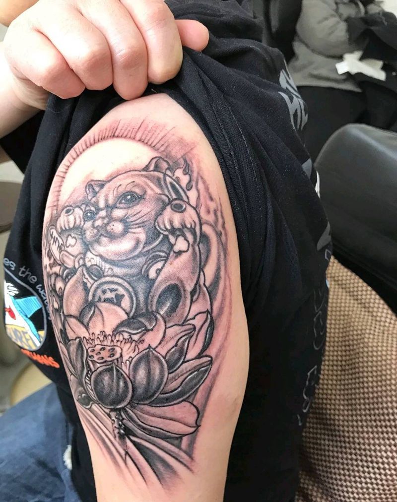 招财猫纹身图片_肩部新传统纹身图案