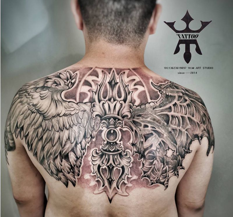当前位置: 首页 >山西省太原市纹身店-纹铭色绘刺青会所纹身图案>翅膀纹身图片_背部新传统翅膀纹身图案