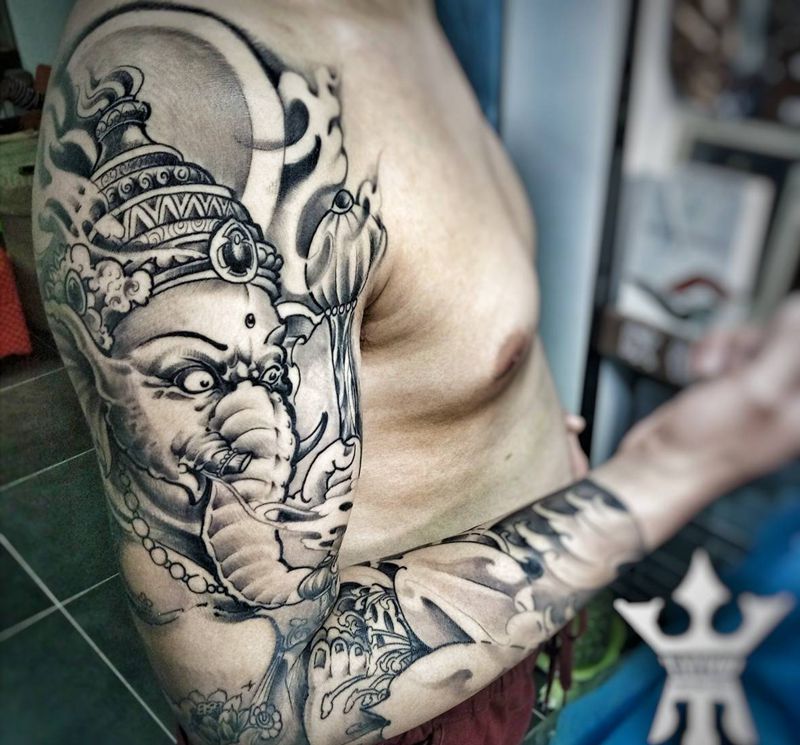 象神恢复后效果纹身图片_肩部手臂新传统象神花臂纹身图案