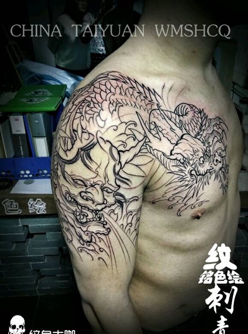 当前位置: 首页 >山西省太原市纹身店-纹铭色绘刺青会所纹身图案>半甲过肩龙纹身图片