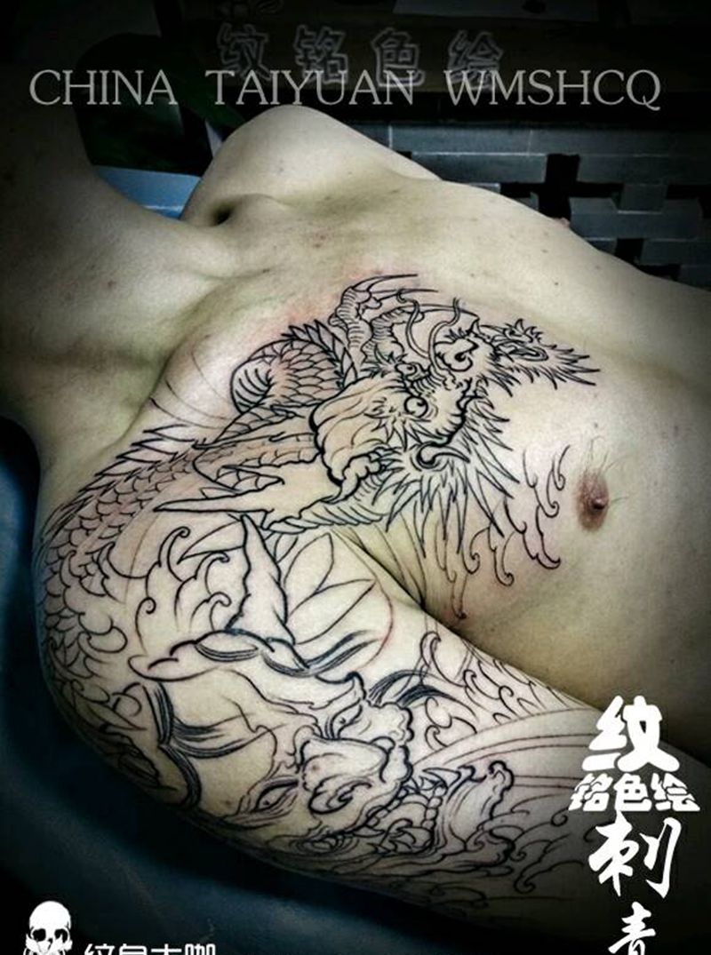 当前位置: 首页 >山西省太原市纹身店-纹铭色绘刺青会所纹身图案>半甲过肩龙纹身图片
