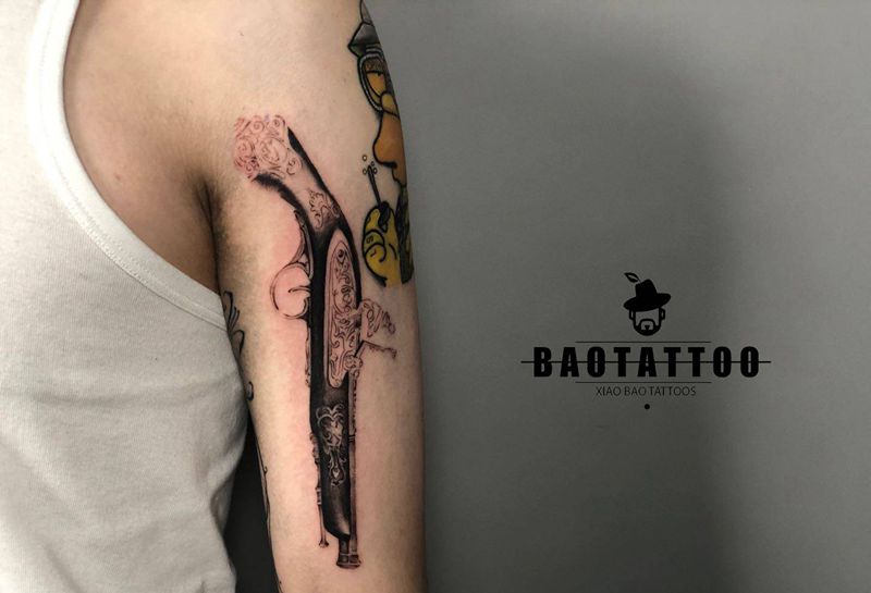老式火枪未完纹身图片_手臂欧美写实纹身图案