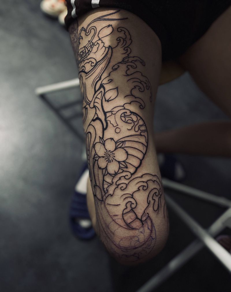 • T网红王老大花腿龙纹身图片_腿部新传统纹身图案