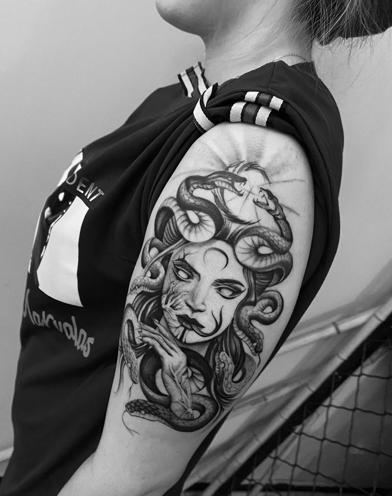 美杜莎纹身图片_手臂肩部欧美写实New School美杜莎女性纹身纹身图案