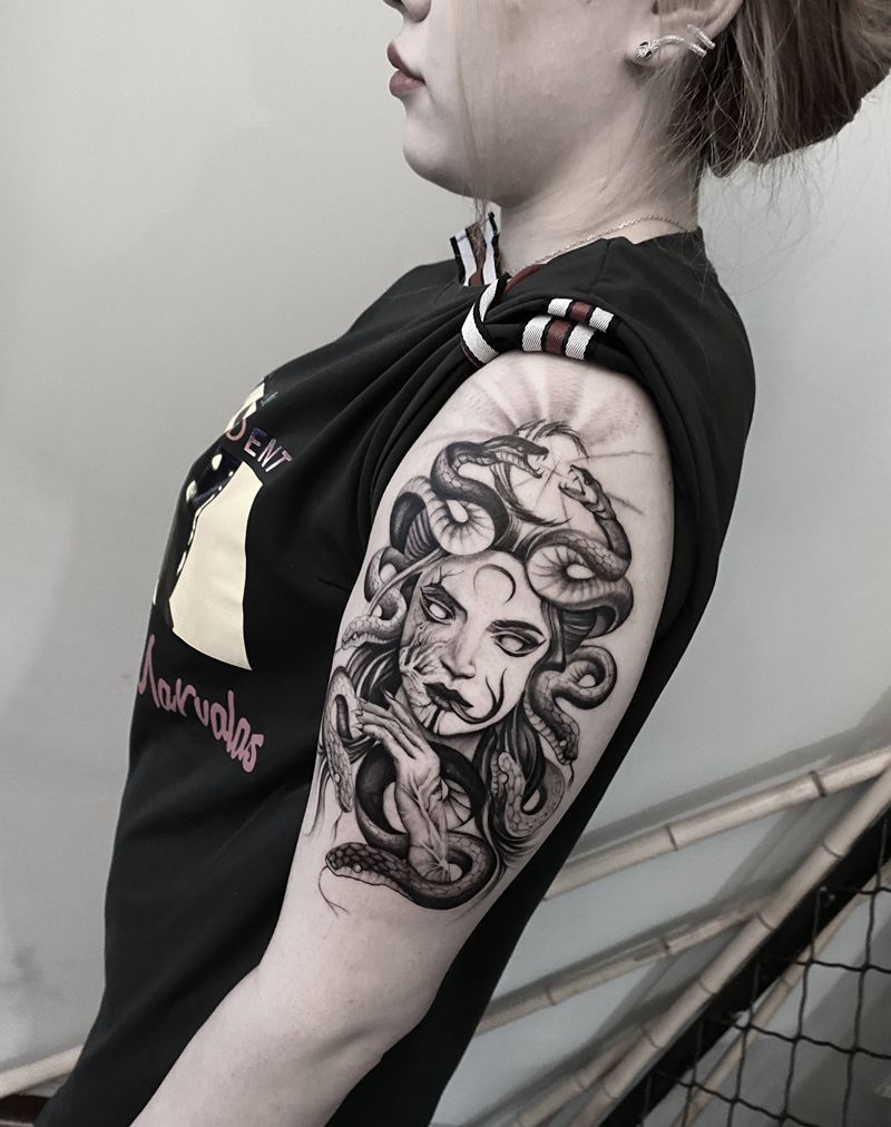 美杜莎纹身图片_手臂肩部欧美写实New School美杜莎女性纹身纹身图案