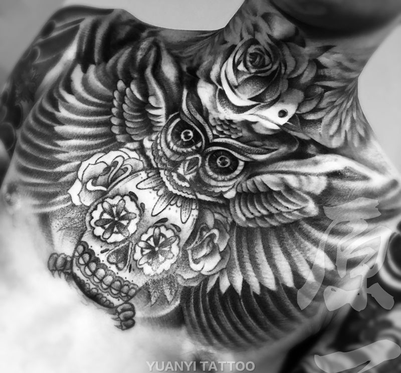 当前位置: 首页 >山西省太原市纹身店-原一刺青处纹身图案>花胸纹身图片_胸部欧美写实点刺猫头鹰骷髅翅膀纹身图案