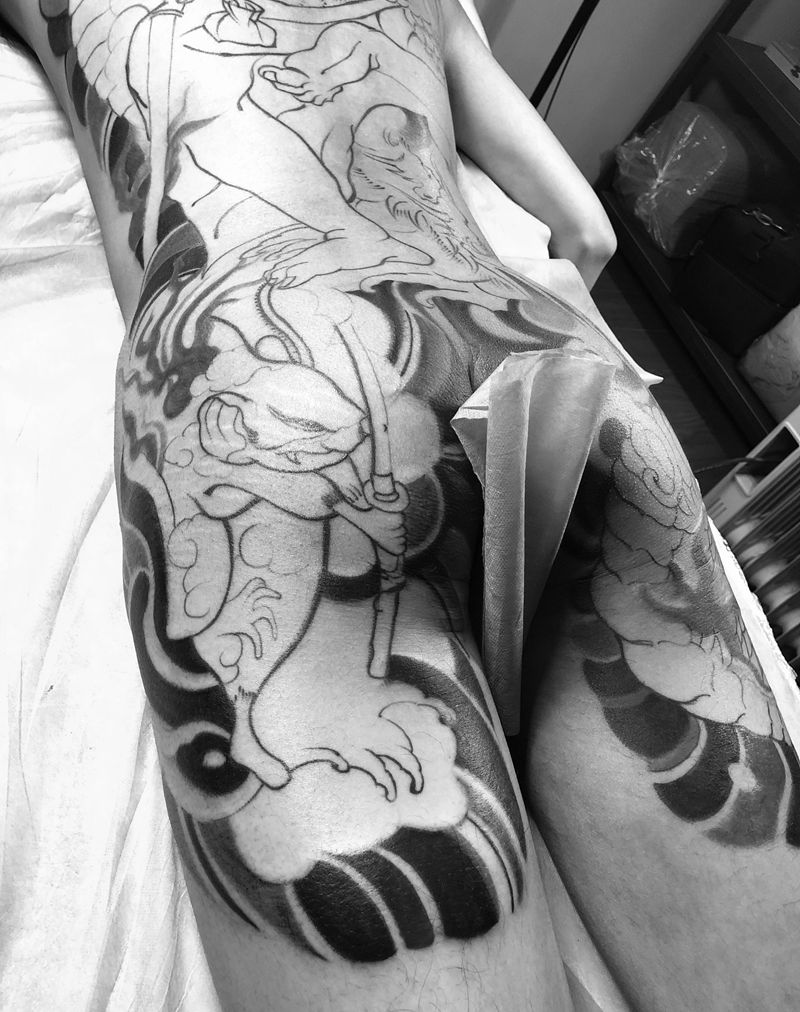 • T网红王老大花腿龙纹身图片_腿部新传统纹身图案
