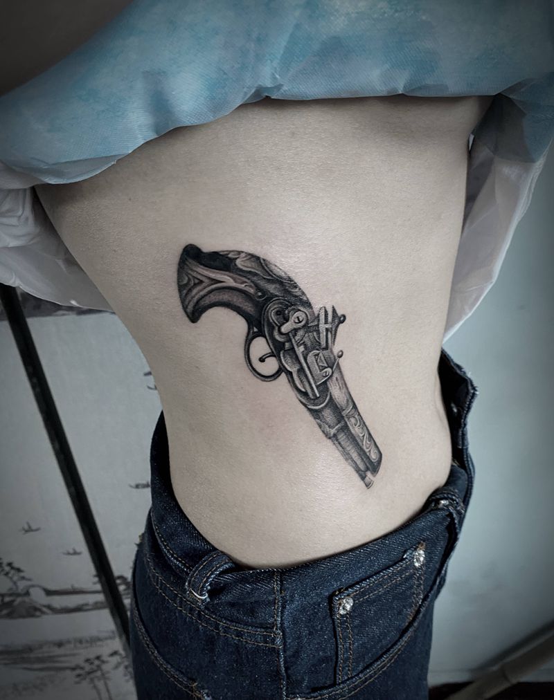 当前位置: 首页 >山西省太原市纹身店-原一刺青处纹身图案>枪纹身图片_腹部腰部点刺欧美写实素描纹身图案
