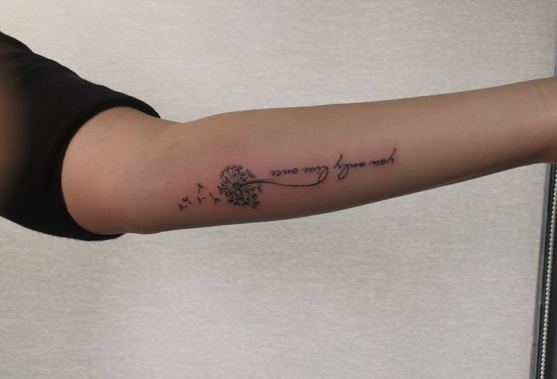 当前位置: 首页 >山西省太原市纹身店-刺青-TATTOO纹身图案>蒲公英纹身图片_手臂花体字纹身图案