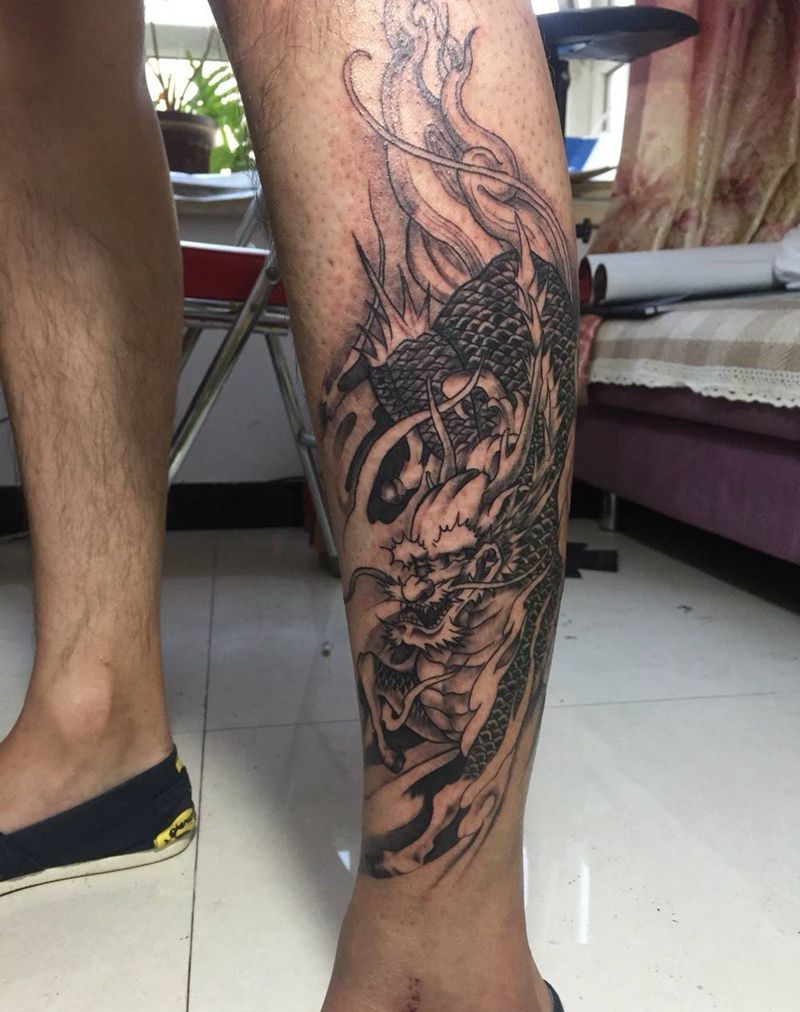 • T网红王老大花腿龙纹身图片_腿部新传统纹身图案