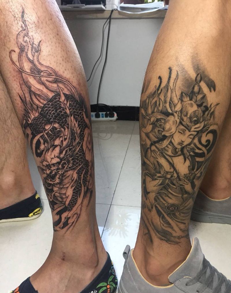 • T网红王老大花腿龙纹身图片_腿部新传统纹身图案