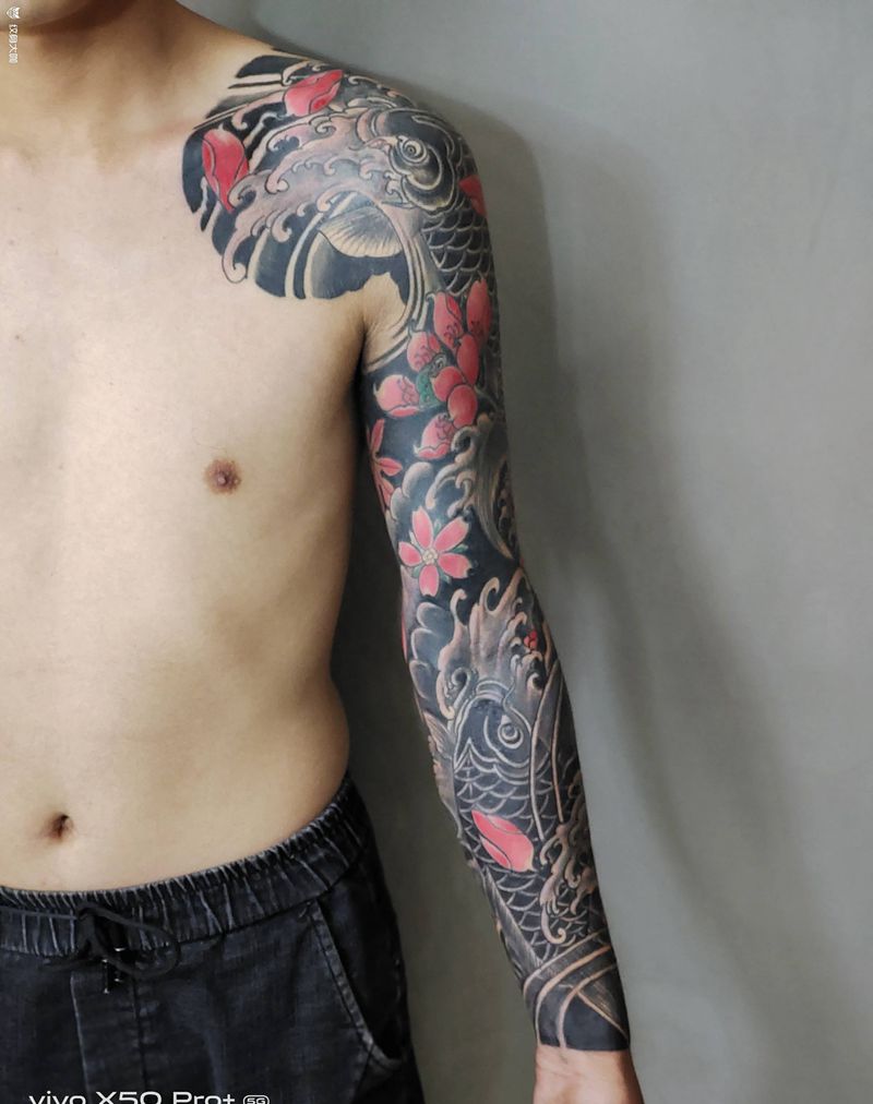 当前位置: 首页 >山西省太原市纹身店-太原翼龙刺青工作室纹身图案>日式老传统花臂招财鱼纹身图片_手臂老传统纹身图案