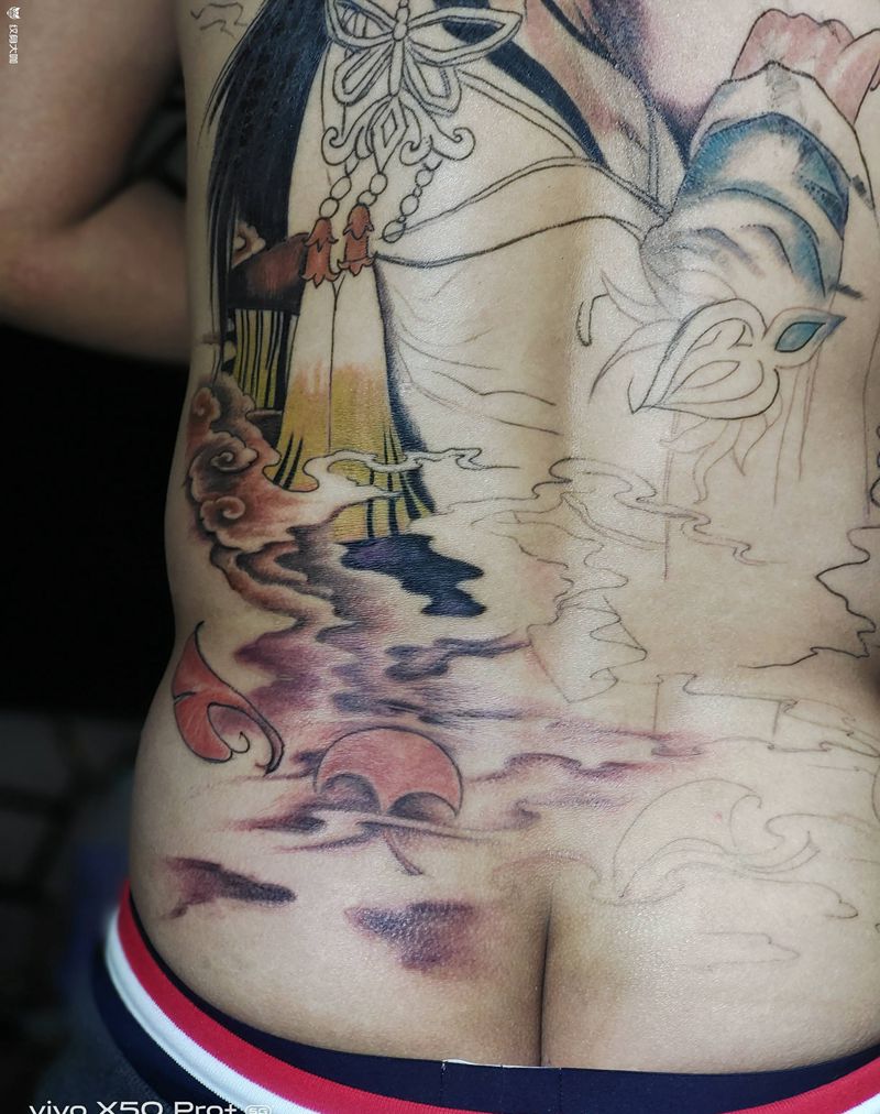 当前位置: 首页 >山西省太原市纹身店-太原翼龙刺青工作室纹身图案>花旦纹身图片_背部新传统水彩纹身图案