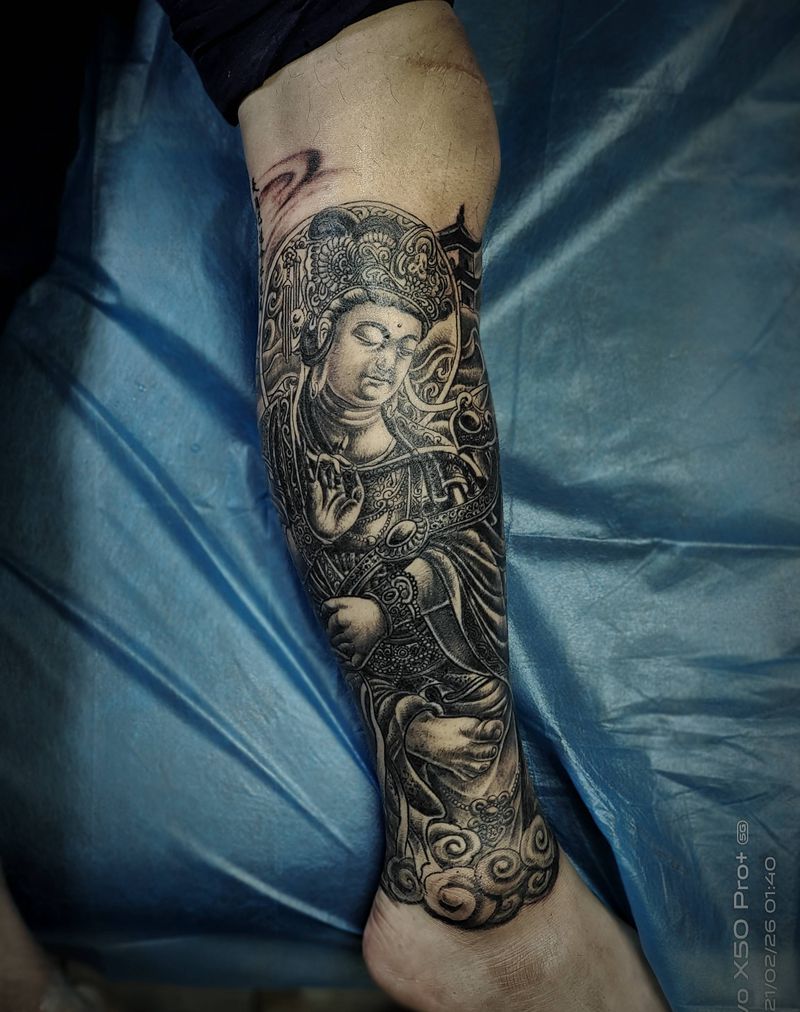当前位置: 首页 >山西省太原市纹身店-太原翼龙刺青工作室纹身图案>普贤菩萨包小腿纹身图片_腿部新传统纹身图案