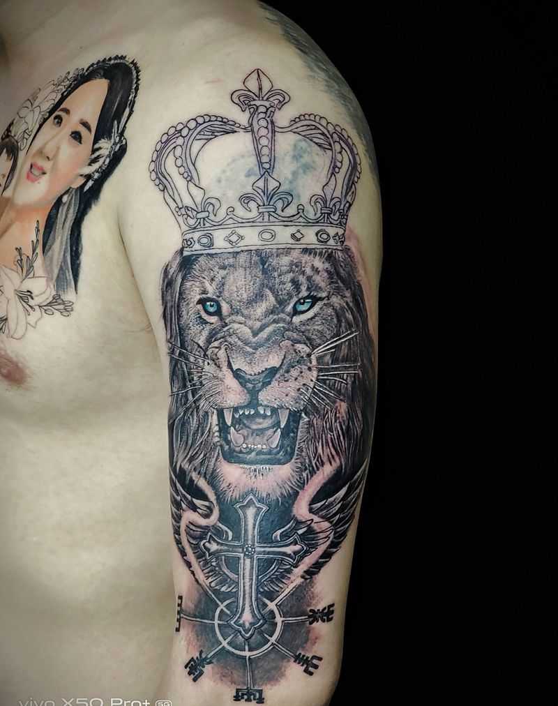 当前位置: 首页 >山西省太原市纹身店-太原翼龙刺青工作室纹身图案>狮子纹身图片_手臂新传统New School纹身图案