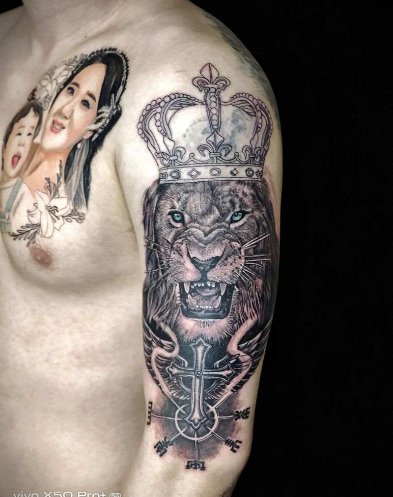 当前位置: 首页 >山西省太原市纹身店-太原翼龙刺青工作室纹身图案>狮子纹身图片_手臂新传统New School纹身图案