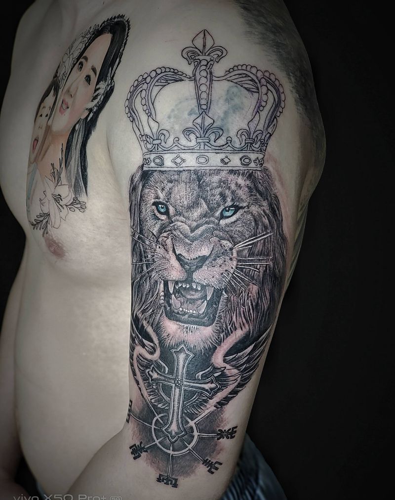 当前位置: 首页 >山西省太原市纹身店-太原翼龙刺青工作室纹身图案>狮子纹身图片_手臂新传统New School纹身图案