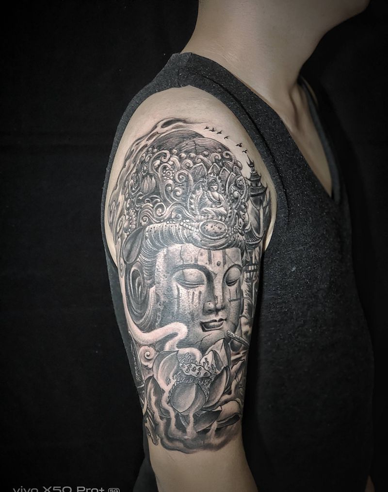 石雕普贤菩萨纹身图片_手臂肩部新传统纹身图案