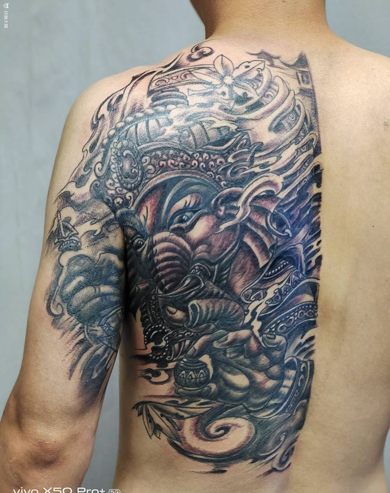 当前位置: 首页 >山西省太原市纹身店-太原翼龙刺青工作室纹身图案>象神纹身图片_背部新传统纹身图案