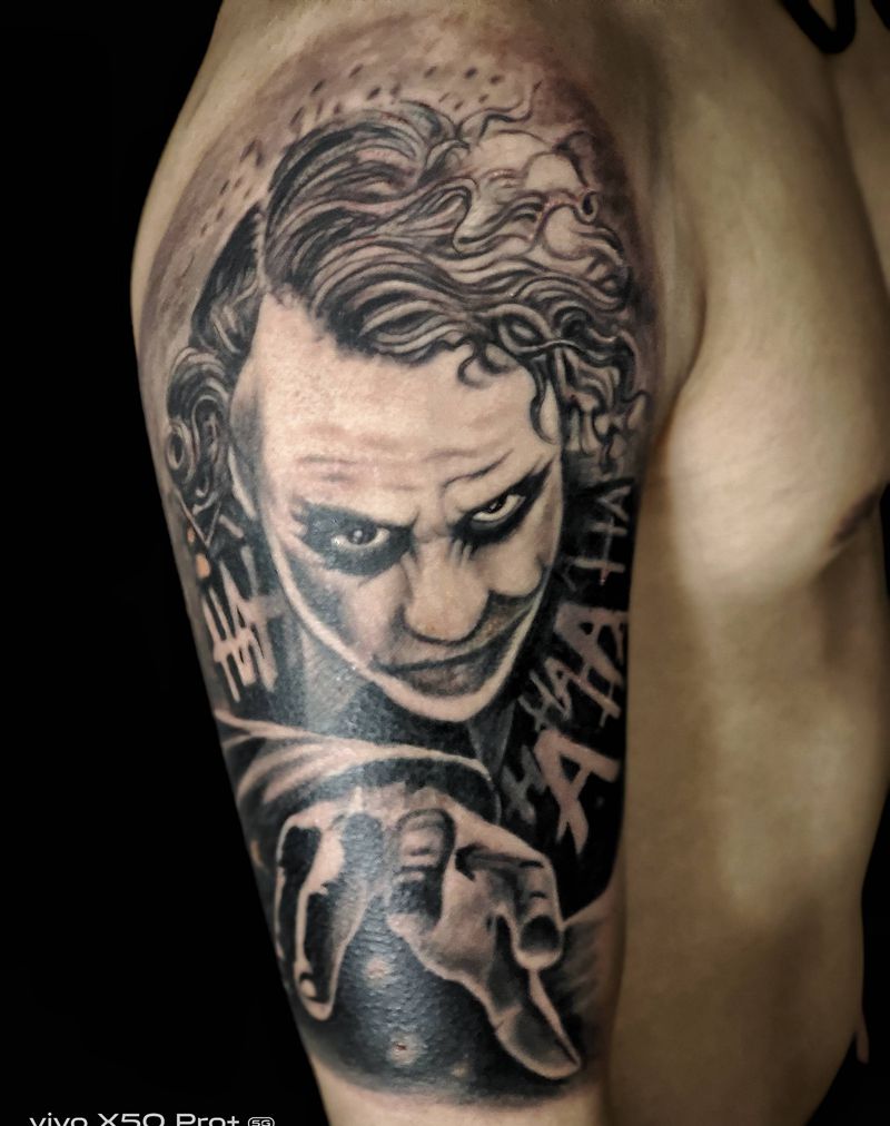 当前位置: 首页 >山西省太原市纹身店-太原翼龙刺青工作室纹身图案>小丑纹身图片_手臂欧美写实纹身图案