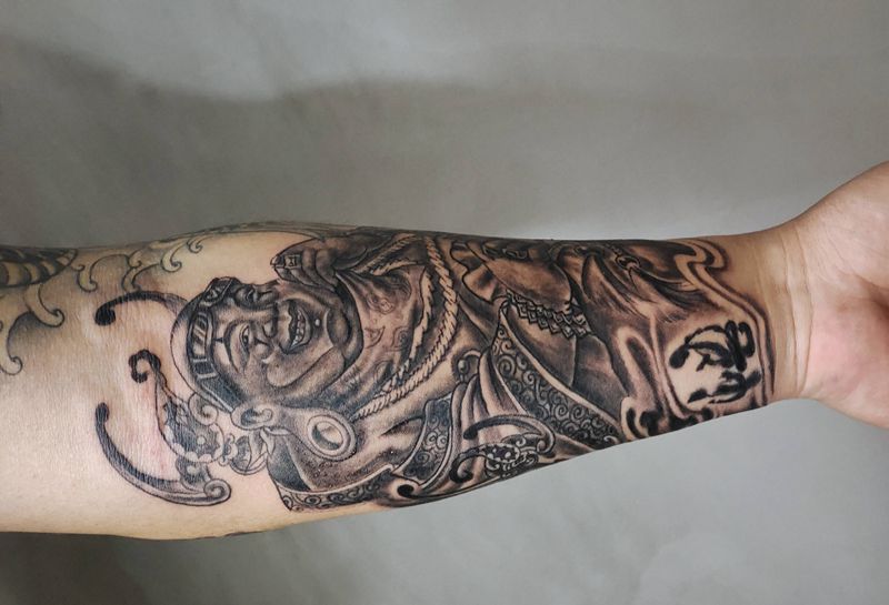 当前位置: 首页 >山西省太原市纹身店-太原翼龙刺青工作室纹身图案>弥勒佛纹身图片_手臂新传统纹身图案