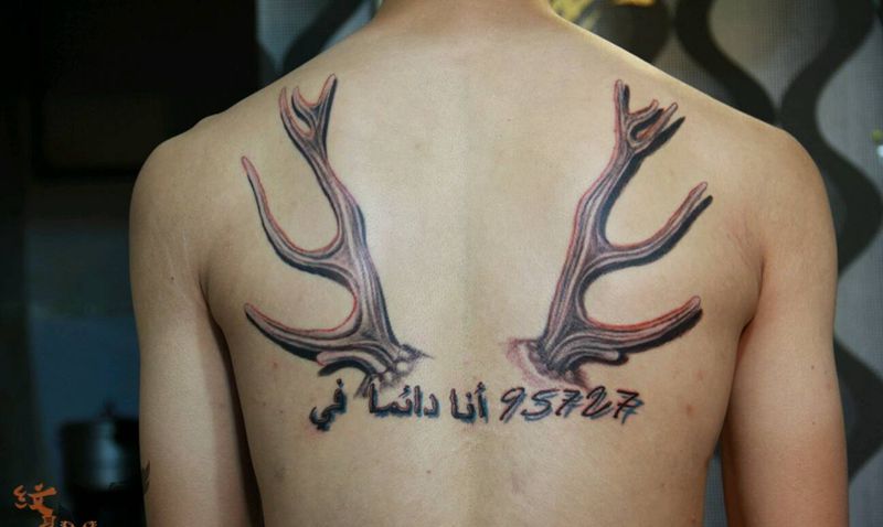 当前位置: 首页 >山西省太原市纹身店-太原翼龙刺青工作室纹身图案>鹿角纹身图片_肩部背部传统清新写实国画字符动物静物原创纹身图案