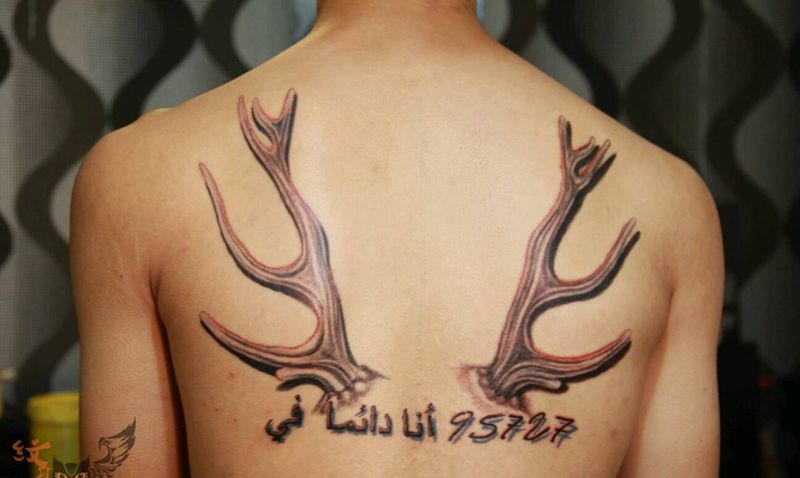 当前位置: 首页 >山西省太原市纹身店-太原翼龙刺青工作室纹身图案>鹿角纹身图片_肩部背部传统清新写实国画字符动物静物原创纹身图案