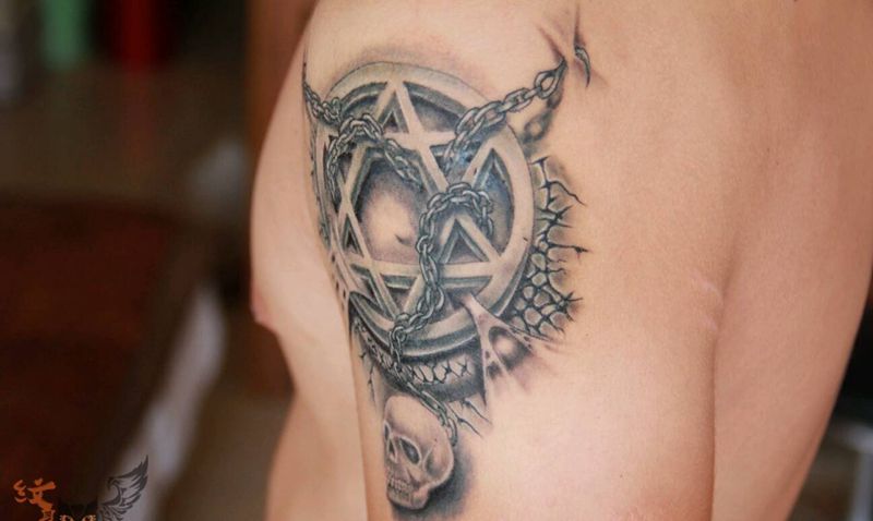 禁锢的魔纹身图片_肩部手臂欧美传统几何鬼神图腾纹身图案