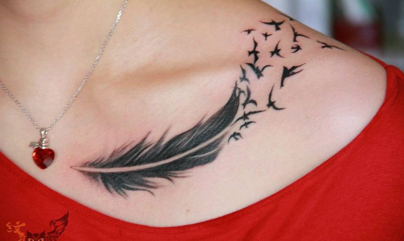 黑色羽毛纹身图片_颈部肩部胸部腰部背部臀部欧美传统清新几何纹身图案