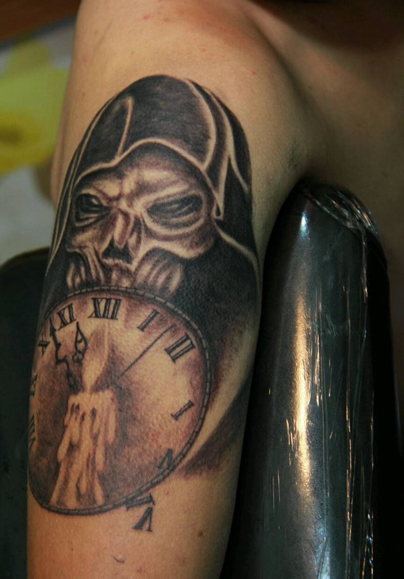 当前位置: 首页 >山西省太原市纹身店-太原翼龙刺青工作室纹身图案>死神的钟声纹身图片_肩部背部手臂欧美习俗肖像写实鬼神原创纹身图案