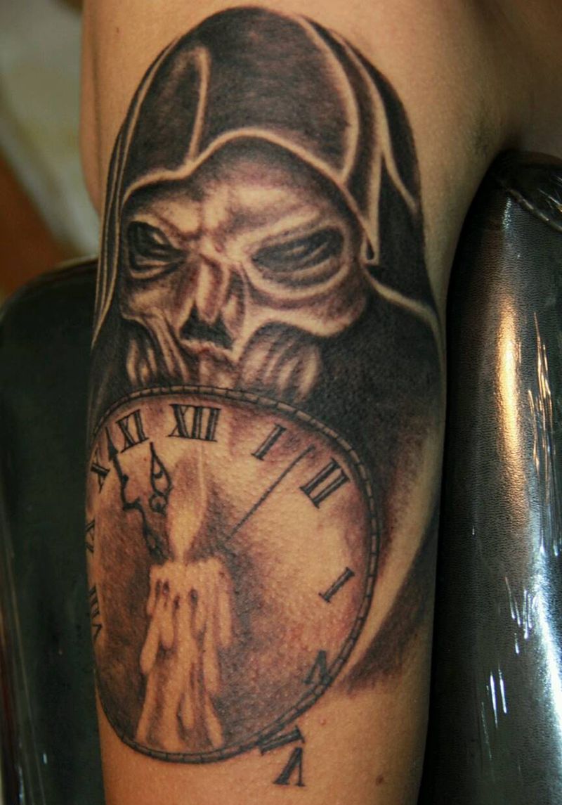 当前位置: 首页 >山西省太原市纹身店-太原翼龙刺青工作室纹身图案>死神的钟声纹身图片_肩部背部手臂欧美习俗肖像写实鬼神原创纹身图案