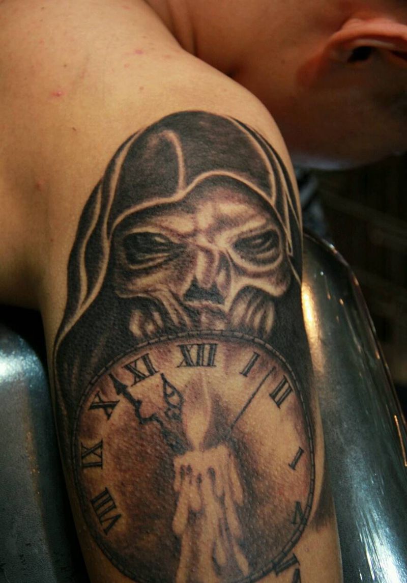 当前位置: 首页 >山西省太原市纹身店-太原翼龙刺青工作室纹身图案>死神的钟声纹身图片_肩部背部手臂欧美习俗肖像写实鬼神原创纹身图案