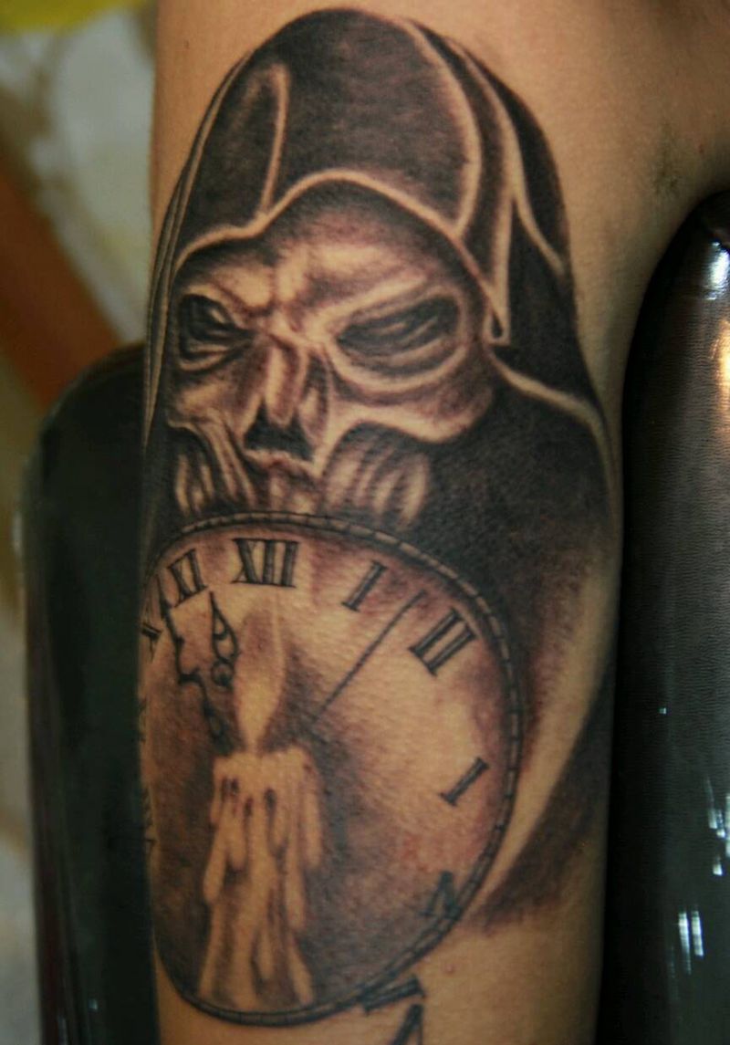 当前位置: 首页 >山西省太原市纹身店-太原翼龙刺青工作室纹身图案>死神的钟声纹身图片_肩部背部手臂欧美习俗肖像写实鬼神原创纹身图案