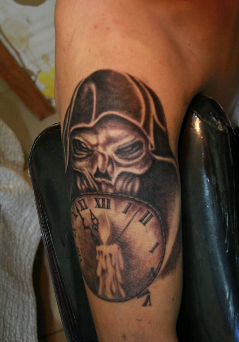 当前位置: 首页 >山西省太原市纹身店-太原翼龙刺青工作室纹身图案>死神的钟声纹身图片_肩部背部手臂欧美习俗肖像写实鬼神原创纹身图案