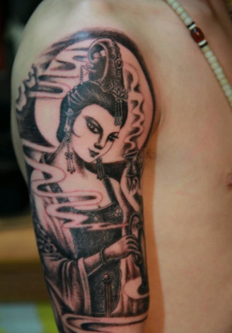 当前位置: 首页 >山西省太原市纹身店-太原翼龙刺青工作室纹身图案>葡萄美酒夜光杯纹身图片_肩部背部手臂腿部传统人物成品纹身图案