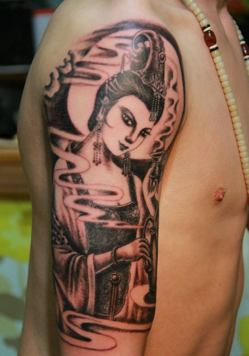 当前位置: 首页 >山西省太原市纹身店-太原翼龙刺青工作室纹身图案>葡萄美酒夜光杯纹身图片_肩部背部手臂腿部传统人物成品纹身图案