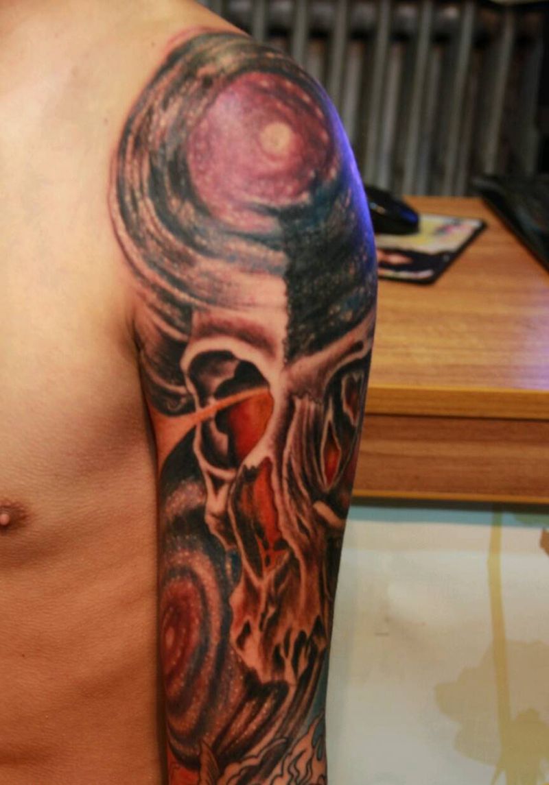 当前位置: 首页 >山西省太原市纹身店-太原翼龙刺青工作室纹身图案>银河系列花臂未完成纹身图片_肩部手臂欧美传统习俗清新动物人物鬼神原创纹身图案