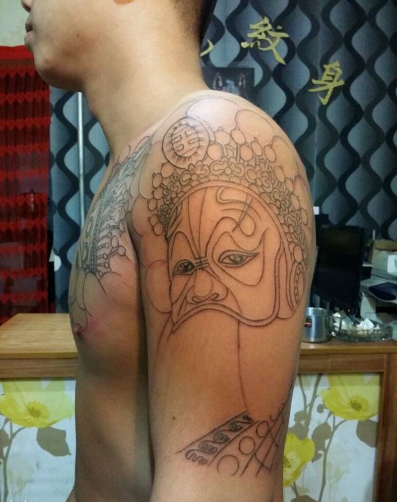 当前位置: 首页 >山西省太原市纹身店-太原翼龙刺青工作室纹身图案>霸王别姬半甲纹身图片_胸部手臂传统肖像清新写实国画人物情侣原创纹身图案