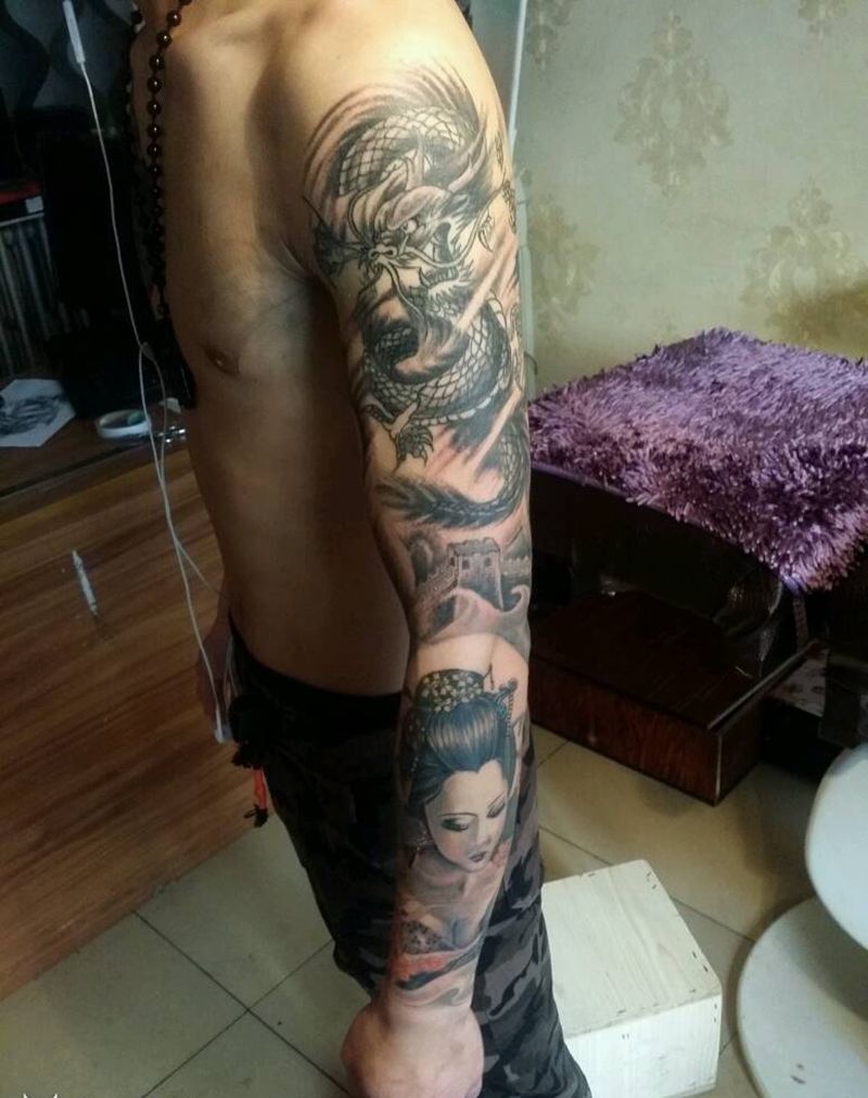 当前位置: 首页 >山西省太原市纹身店-太原翼龙刺青工作室纹身图案>老图接花臂完成纹身图片_肩部手臂传统习俗肖像人物鬼神成品纹身图案