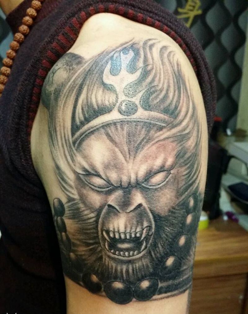 当前位置: 首页 >山西省太原市纹身店-太原翼龙刺青工作室纹身图案>大圣归来纹身图片_肩部手臂腿部手部传统鬼神成品纹身图案