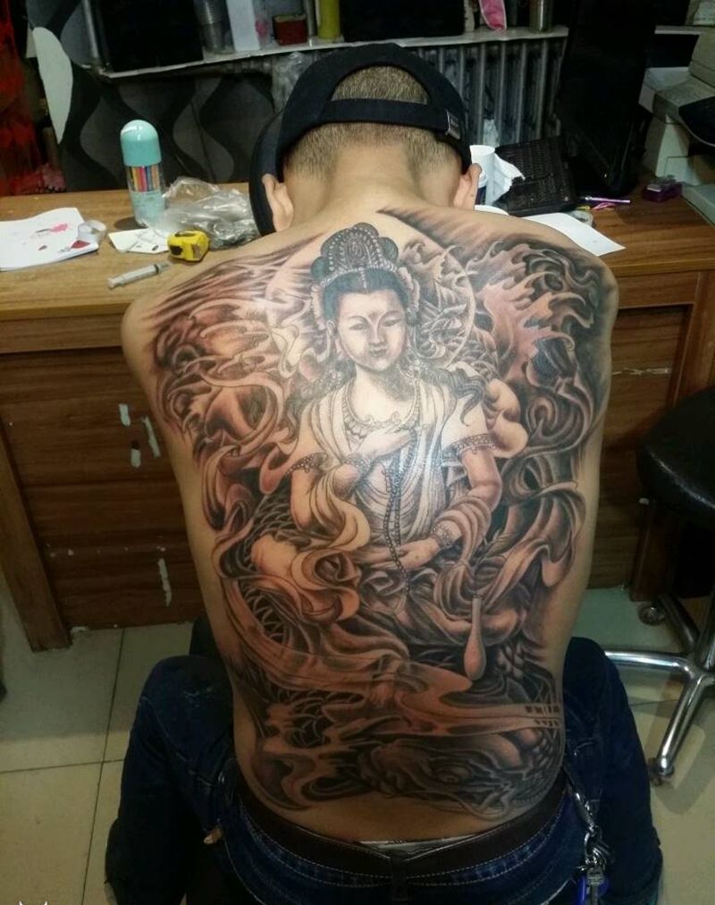 当前位置: 首页 >山西省太原市纹身店-太原翼龙刺青工作室纹身图案>观音骑鱼纹身图片_背部传统习俗写实国画人物鬼神成品纹身图案