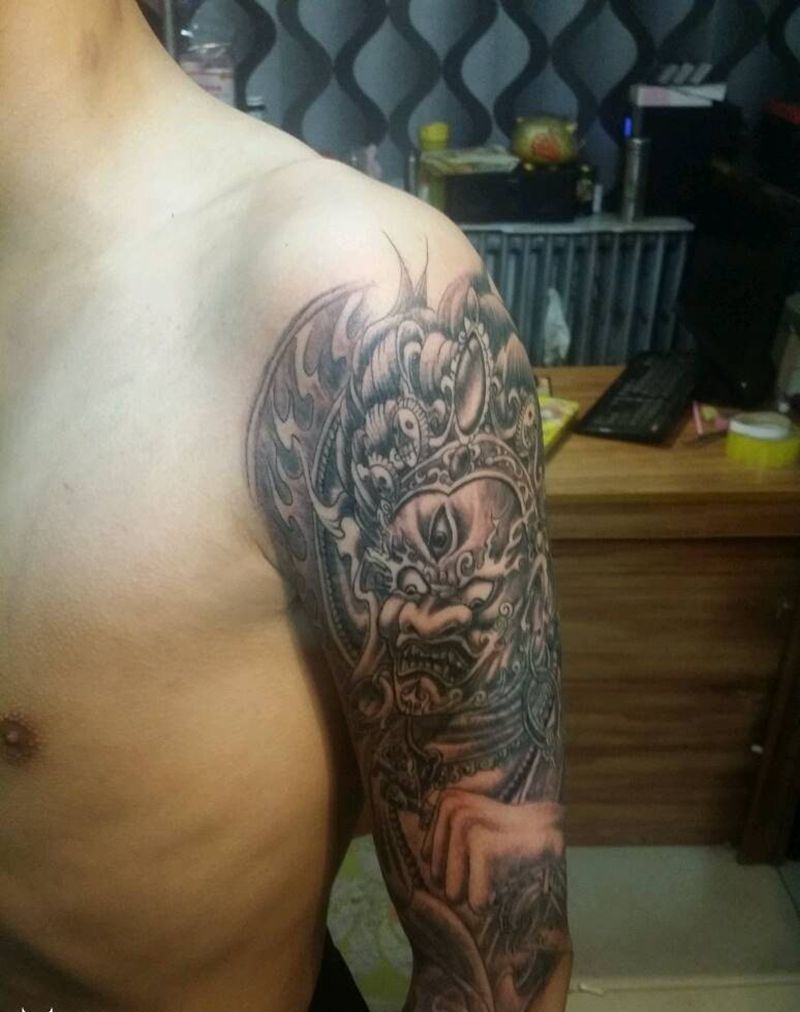 当前位置: 首页 >山西省太原市纹身店-太原翼龙刺青工作室纹身图案>大黑天纹身图片_肩部背部手臂手部传统习俗肖像人物鬼神成品纹身图案