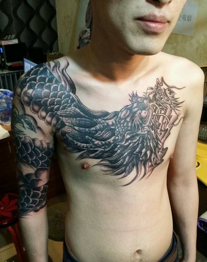 当前位置: 首页 >山西省太原市纹身店-太原翼龙刺青工作室纹身图案>爆改过肩龙纹身图片_肩部胸部手臂传统原创成品纹身图案