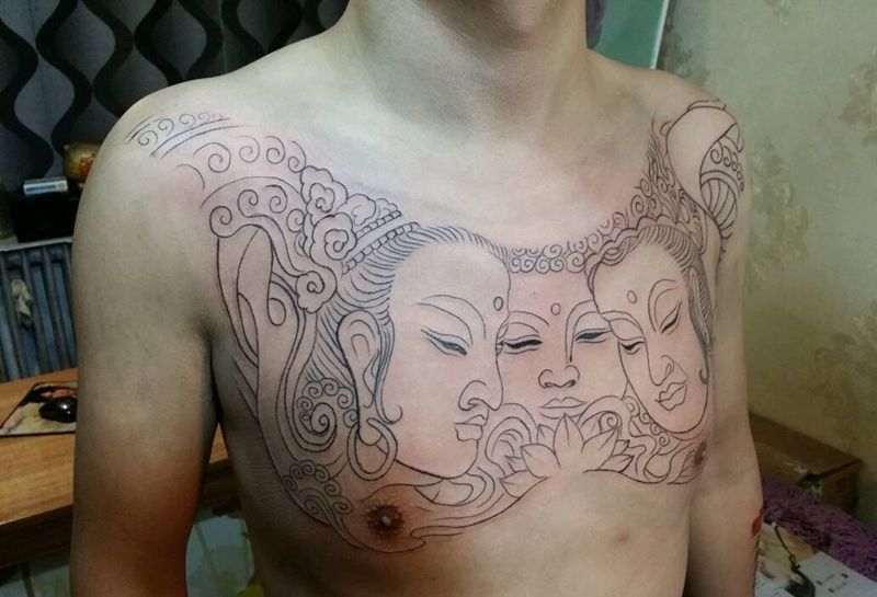 三面佛纹身图片_胸部传统习俗肖像写实国画人物静物鬼神宗教纹身图案