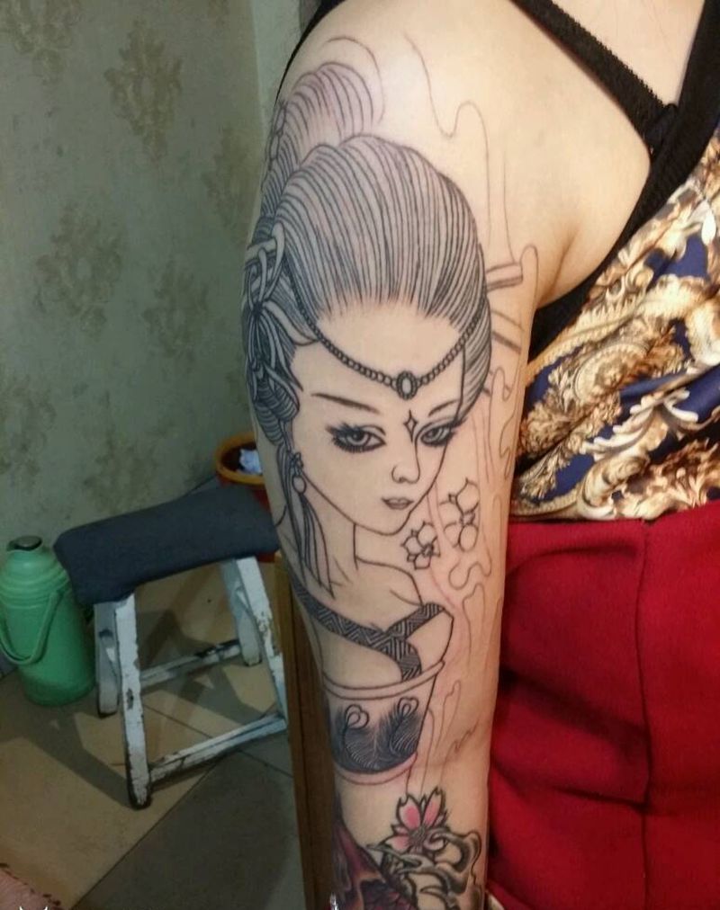 艺妓花臂未完成纹身图片_手臂传统习俗清新写实动物人物植物纹身图案