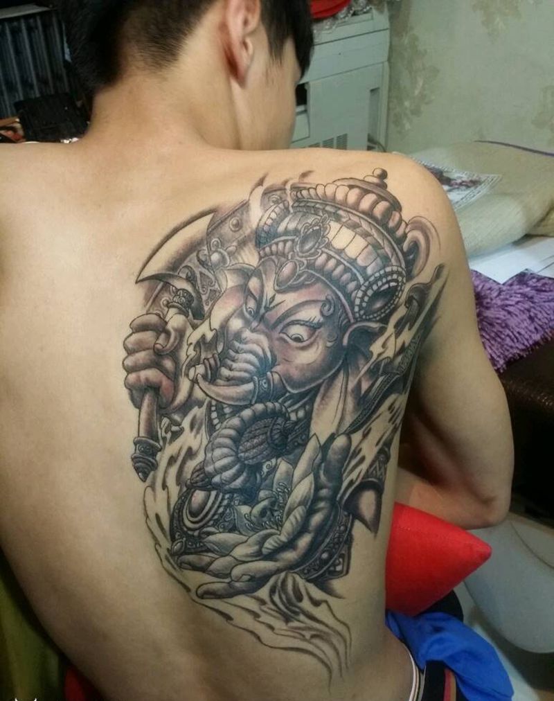 当前位置: 首页 >山西省太原市纹身店-太原翼龙刺青工作室纹身图案>招财象神纹身图片_肩部背部传统清新动物鬼神成品纹身图案
