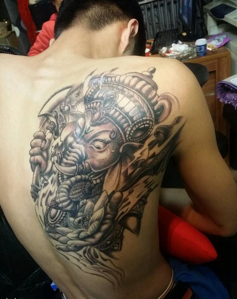 当前位置: 首页 >山西省太原市纹身店-太原翼龙刺青工作室纹身图案>招财象神纹身图片_肩部背部传统清新动物鬼神成品纹身图案