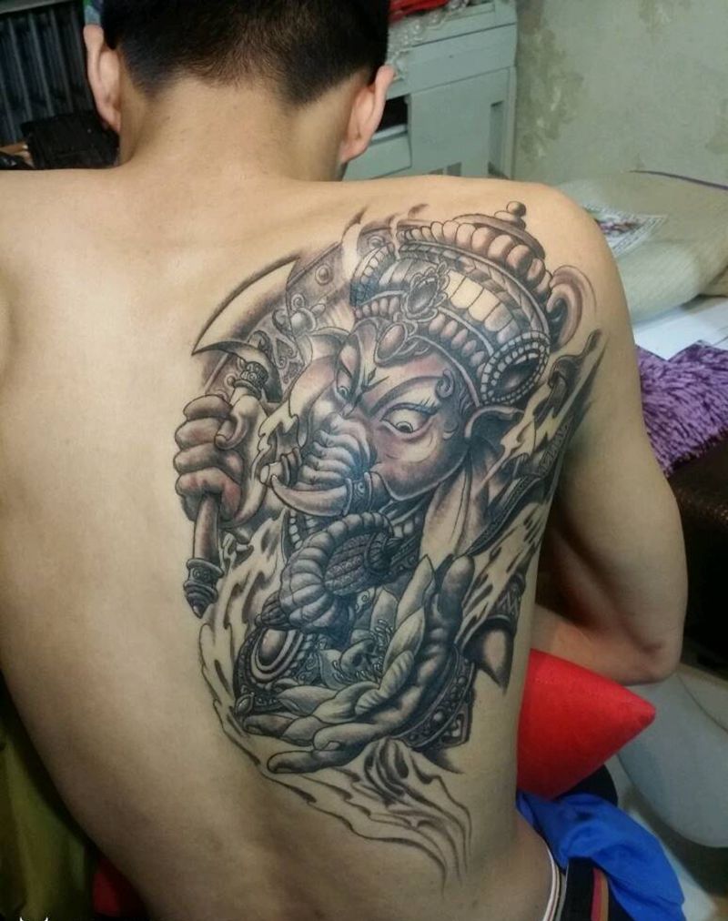 当前位置: 首页 >山西省太原市纹身店-太原翼龙刺青工作室纹身图案>招财象神纹身图片_肩部背部传统清新动物鬼神成品纹身图案