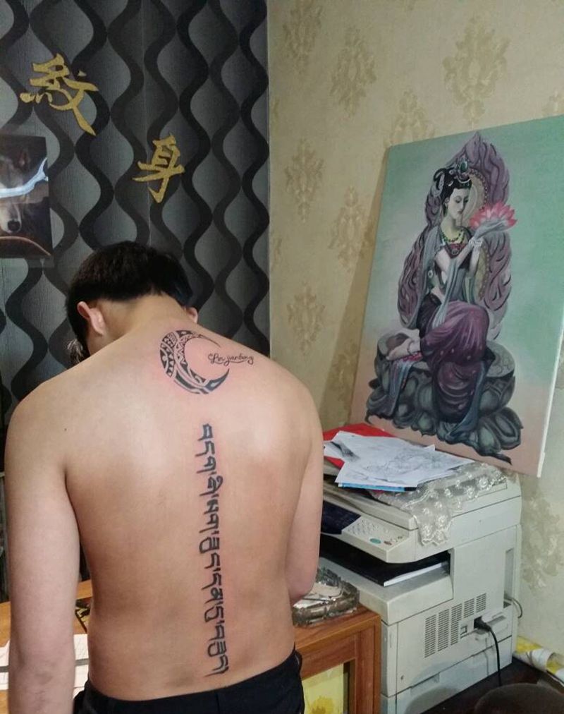 月亮图腾带梵文纹身图片_颈部腰部背部传统字符图腾成品纹身图案